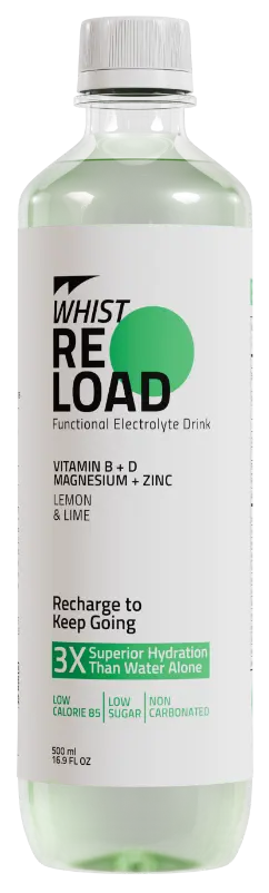 Functional Electrolyte DrinkReload contains magnesium for electrolyte balance, vitamin B12 for energy metabolism, vitamin D for muscle function, and zinc to support immune healthRecharge Recharge Keep Contribute to Normal Energy-Yielding MetabolismVitamin B + DMagnesium + ZINCLemon & LimeLow SugarWHISTWith whist We recommend avaried and balanced diet and LOADREahealthy lifestyleWith whist We recommend avaried and balanced diet and ahealthy lifestyleWHISTRELOADGoing